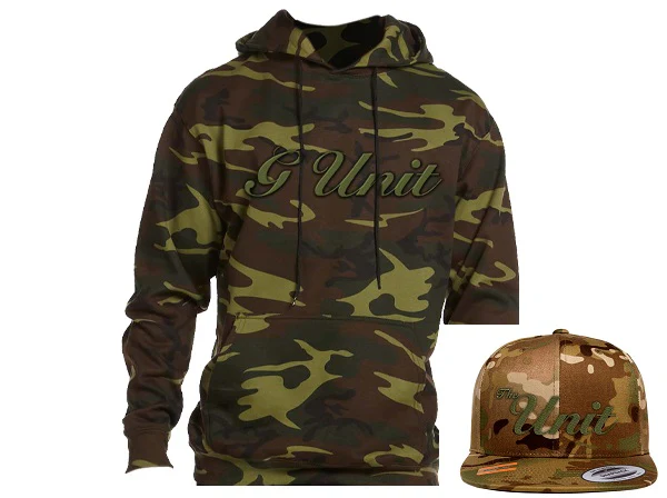 Receive the official "G-Unit" embroidered Hoodie + the matching "G-Unit Snapback!Ā Available in black, black/gray and camo.